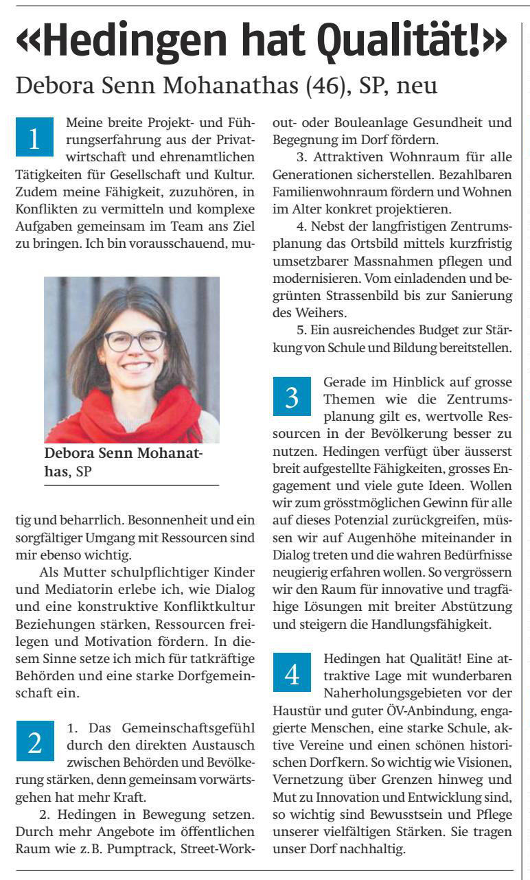 Wir gratulieren Fabian Kraxner (bisher) und Debora Senn Mohanathas (neu) zur Wahl in den Gemeinderat von Hedingen.